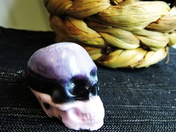 skull / tête de mort fait mains en modèle unique , en résine lilas , noir et rose bonbon