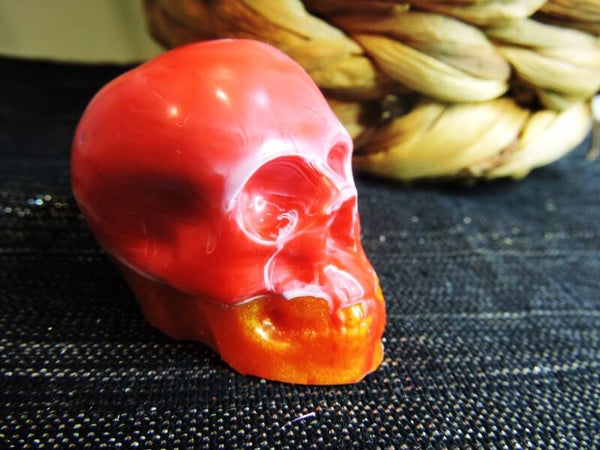 skull / tête de mort fait mains en modèle unique , en résine ,rouge /orange et blanc