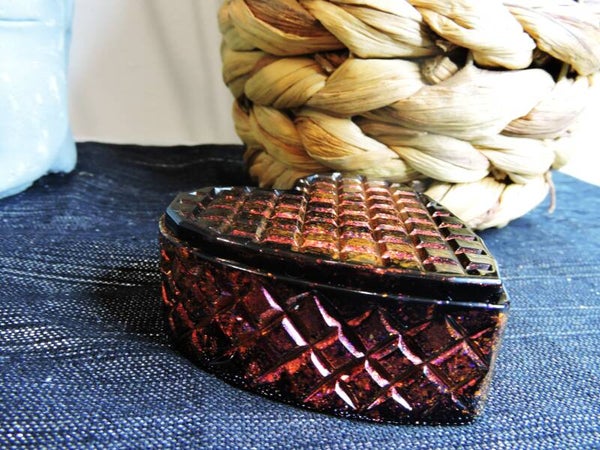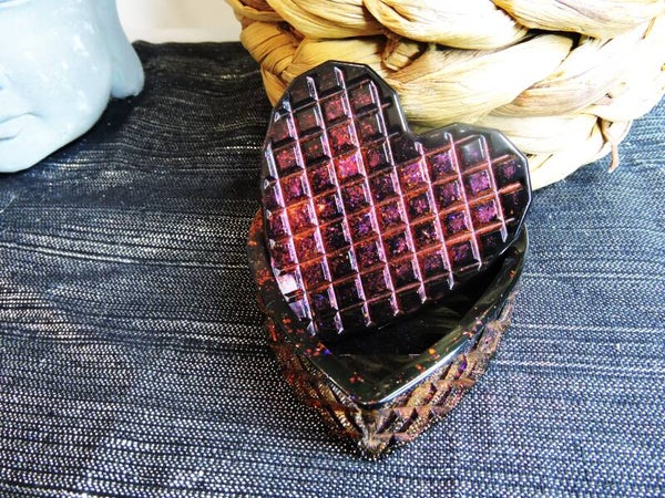 boite en résine en forme de coeur avec motif quadrillage dans des tons rouge et noir
