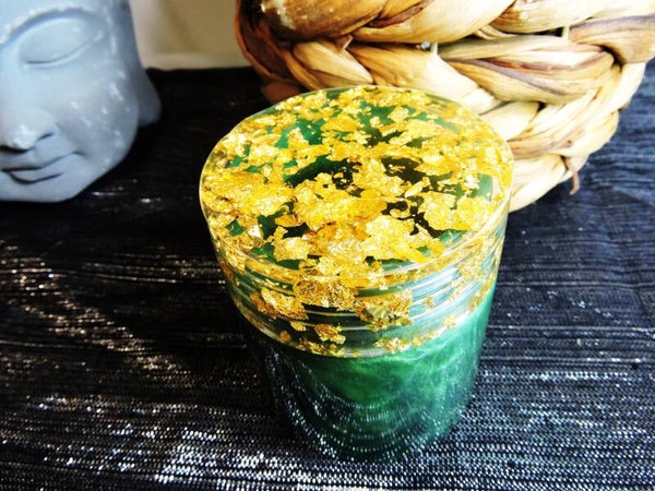 boite en résine avec couvercle à visser , contenant vert et couvercle transparent avec incrustation de feuilles d'or