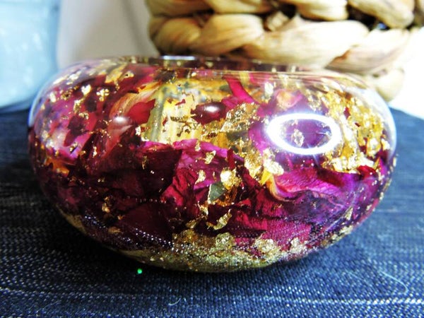 coupelle en résine avec pétales de roses rouges et feuilles d'or incrustés