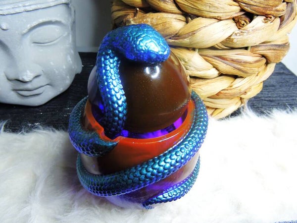 Boite en résine en forme d'oeuf violet translucide avec un serpent bleu enroulé autour