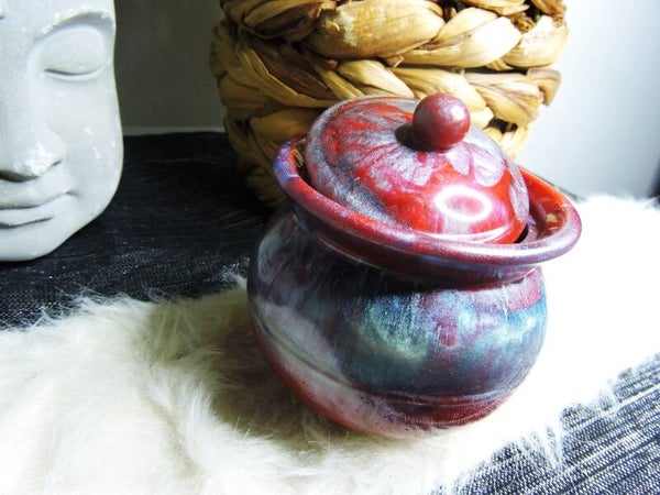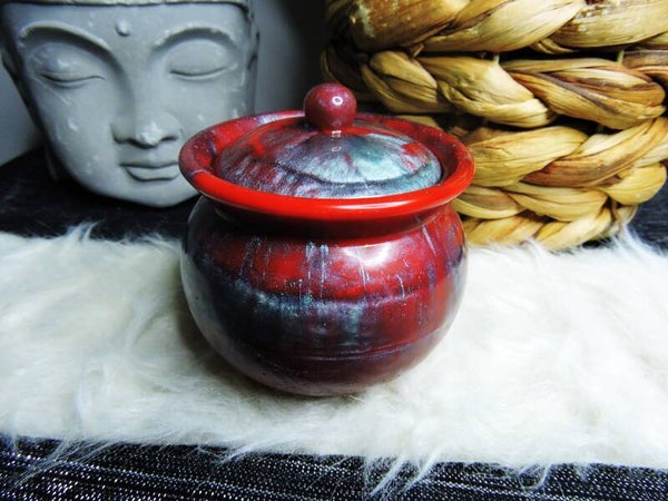 boite en résine en forme de chaudron , turquoise et rouge
