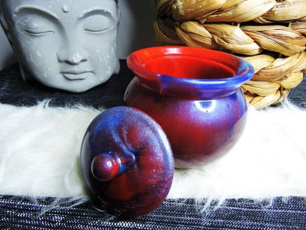 boite en résine en forme de chaudron ,rouge et nuances de bleu