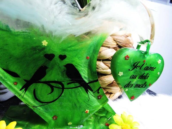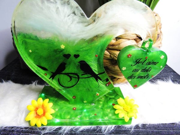 Décoration en résine coeur en suspension sur grand coeur avec lumiere led incrustée dans le socle (fonctionne à pile ) , motif oiseaux et inscription "je t'aime au delà des mots "