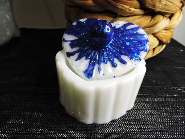 boite coeur en résine faite mains , contenant blanc et couvercle bleu et blanc