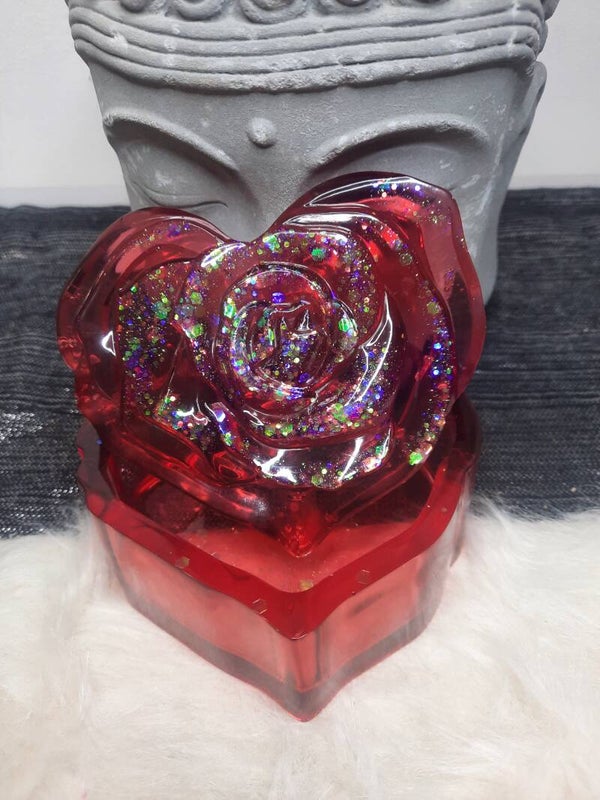 Boite en forme de cœur avec une rose en relief sur le couvercle , en résine en modèle unique