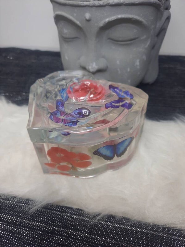 Boite en forme de cœur avec une rose en relief sur le couvercle , en résine en modèle unique