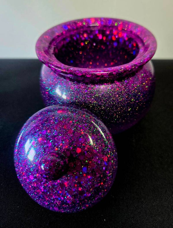 boite en résine en forme de chaudron , violet/fuschia pailletée