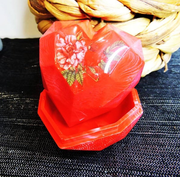 petite boite en résine en forme de coeur en origami , rouge avec un motif floral sur le couvercle
