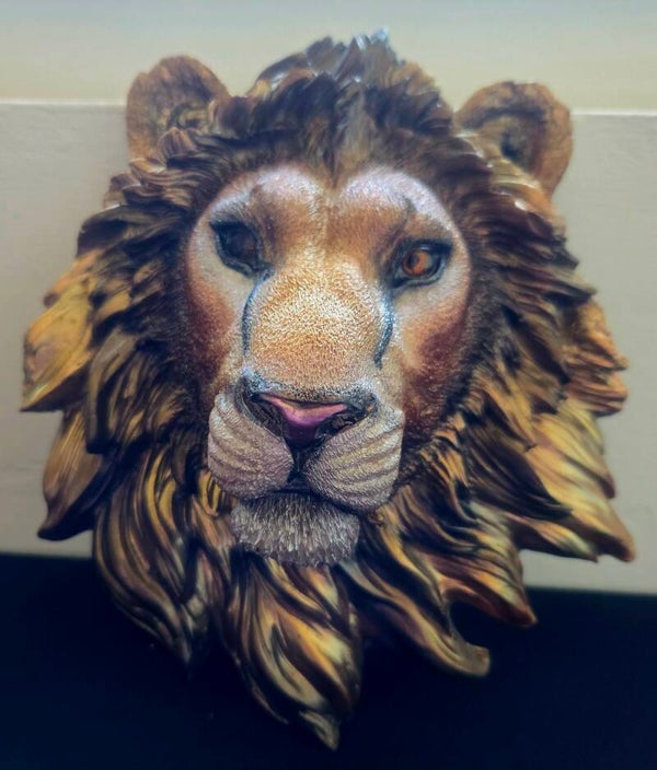 tête de lion en relief en résine , mélange de couleurs pour un effet réaliste avec un crochet à l'arrière pour être suspendu