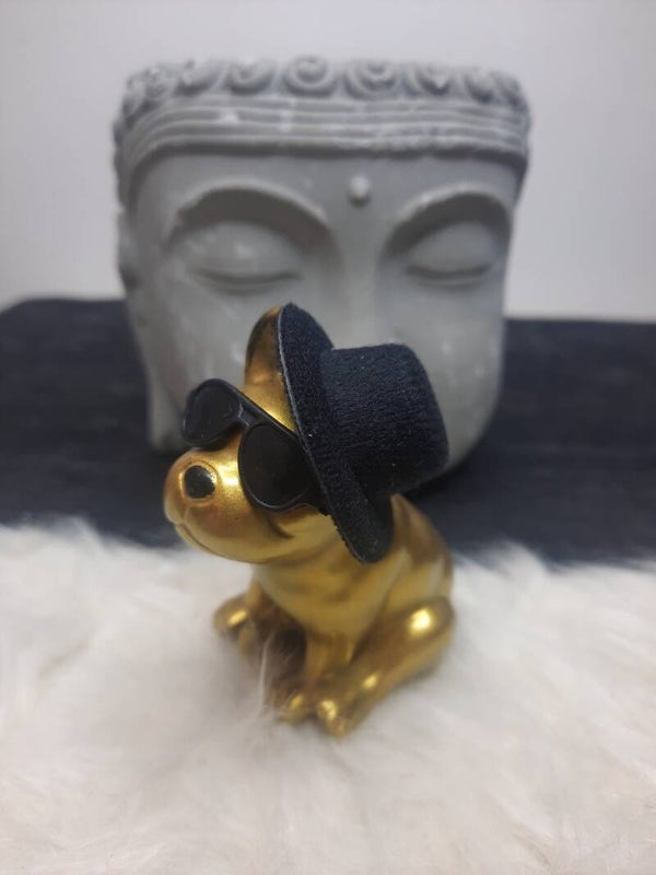 bouledogue en résine , doré avec chapeau et lunettes de soleil
