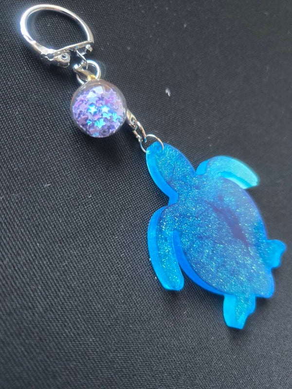 porte clés tortue plate bleue pailleté avec pampille petite boule rempli d'étoiles violettes