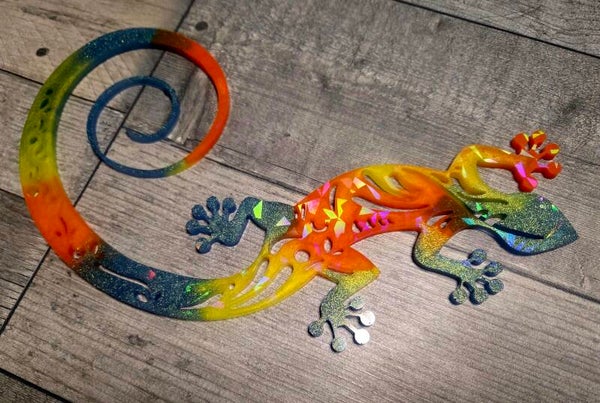 Lézard holographique en résine dans un mélange de jaune /orange/bleu/vert