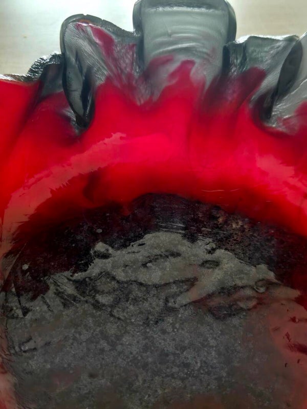 Plat creux en resine , dans des coloris noir et rouge faisant penser à un coquelicot et pailleté noir au centre