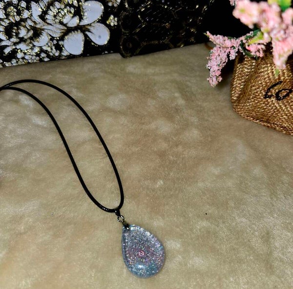 collier avec pendentif en résine avec incrustation de petites billes à reflets multicolores , sur cordon noir